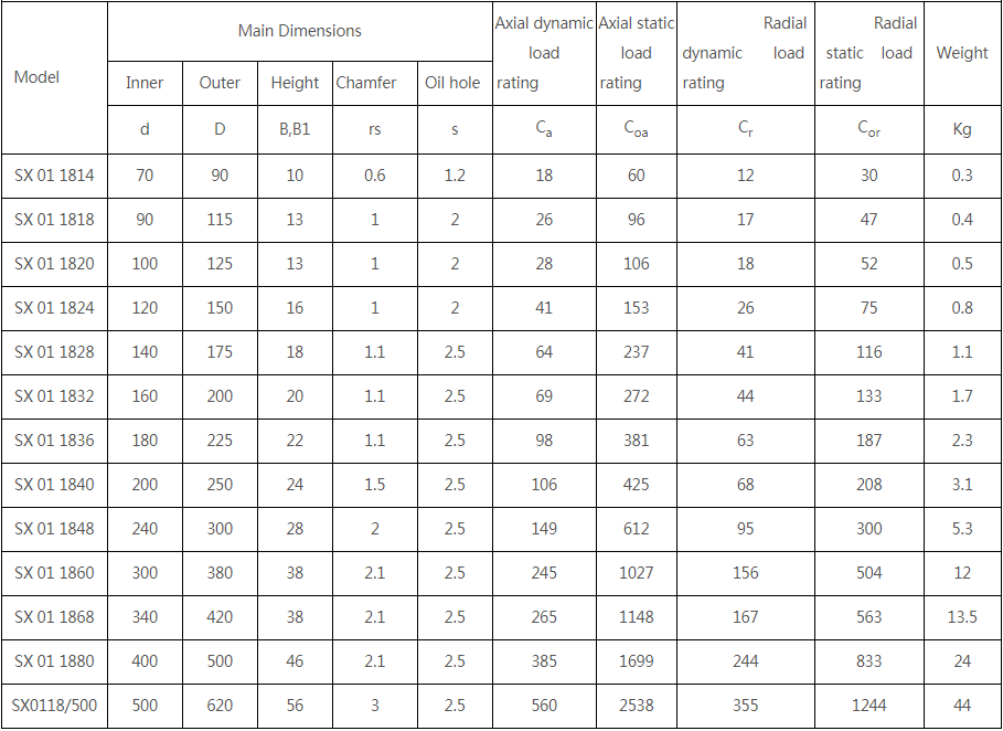 SX系列交叉滾子軸承(內(nèi)圈整體、外圈分體型、超?。?。在相同軸頸條件下,SX系列十字滾子軸承的截面尺寸比RB系列小。由于超薄設(shè)計,外圈和內(nèi)圈沒有安裝孔,安裝時需要法蘭和支撐座固定,適合內(nèi)圈旋轉(zhuǎn)的應(yīng)用。